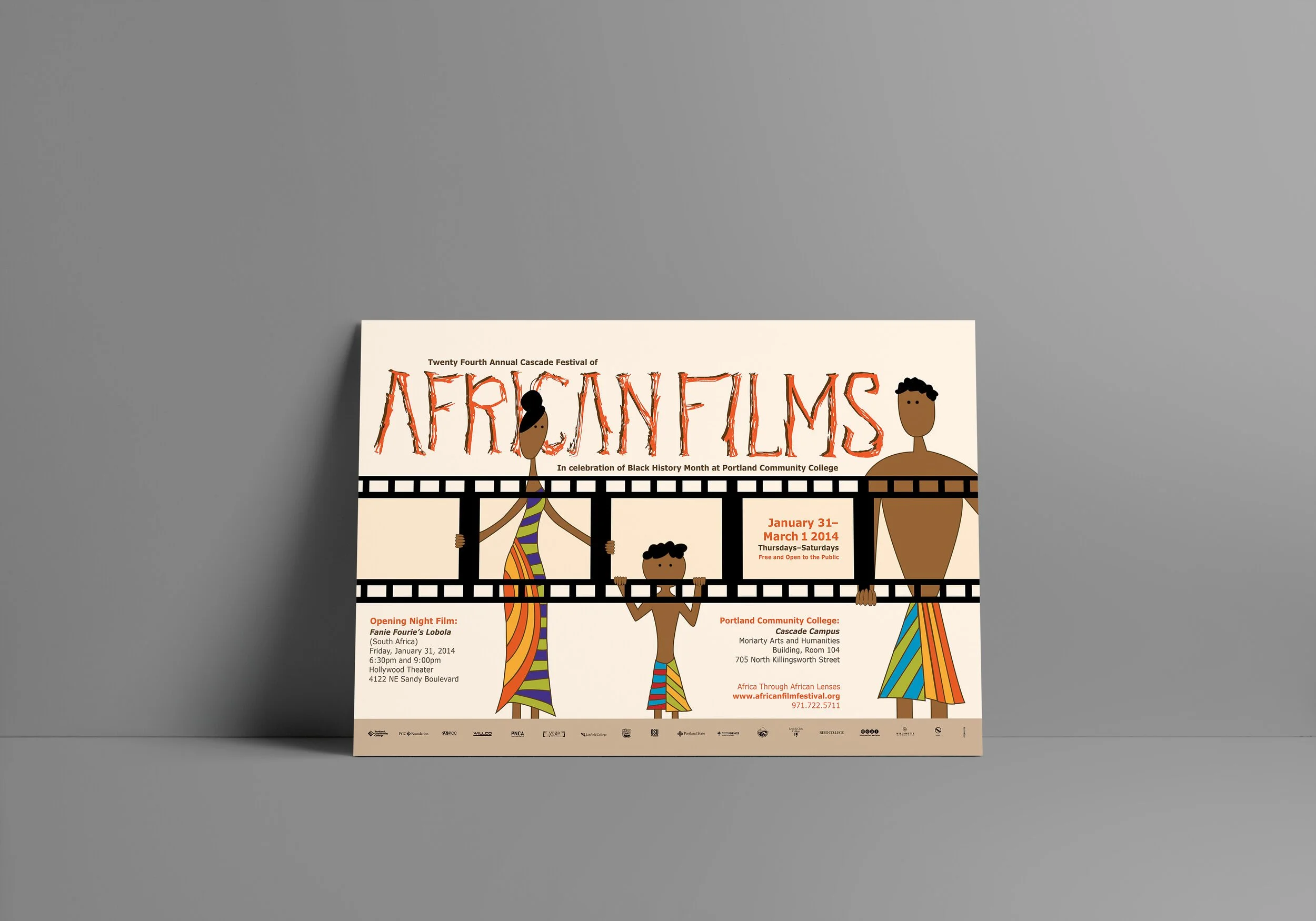 Similar to a logo, I sketched all and any ideas to find the best one to represent the African Films Festival in Portland. In this case, I chose idea #11 of a family holding a film strip with the boy peeping through.